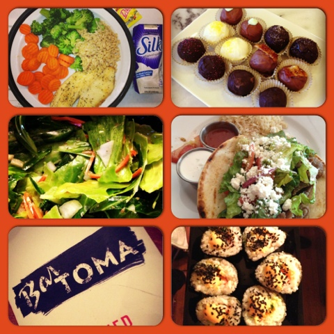 | Left top to bottom: OSF tilapia, kale salad, Bar Toma Chicago Pizzeria menu Right top to bottom: Innkeeper's truffles, Aya Sofia gyro, homemade sushi with Golda |
